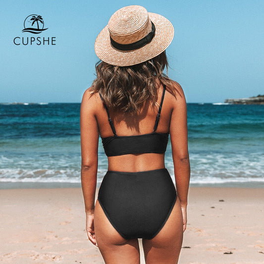 CUPSHE Solid Black Twist High Waist Bikini Sets Swimsuit For Women Sexy V-neck Tank Two Pieces Swimwear 2023 Beach Bathing Suit