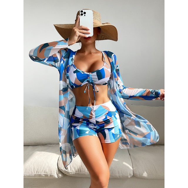 High Waist Bikinis 2022 Sexy 3 Piece Bikini Set Cover Up Swimsuit for Women Long Sleeve Push Up Swimwear Beach Wear Bathing Suit