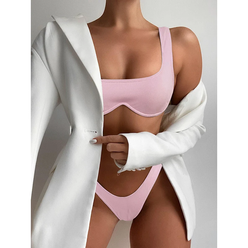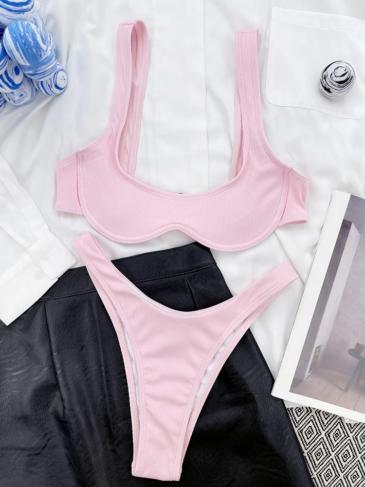 INGAGA Push Up Women's Bikinis Sexy Ribbed Swimsuit 2023 New Solid Swimwear Women High Cut Biquini Set Square Neck Bathing Suits