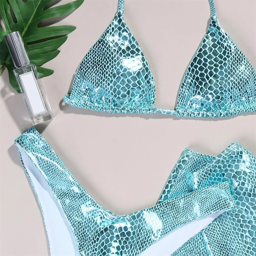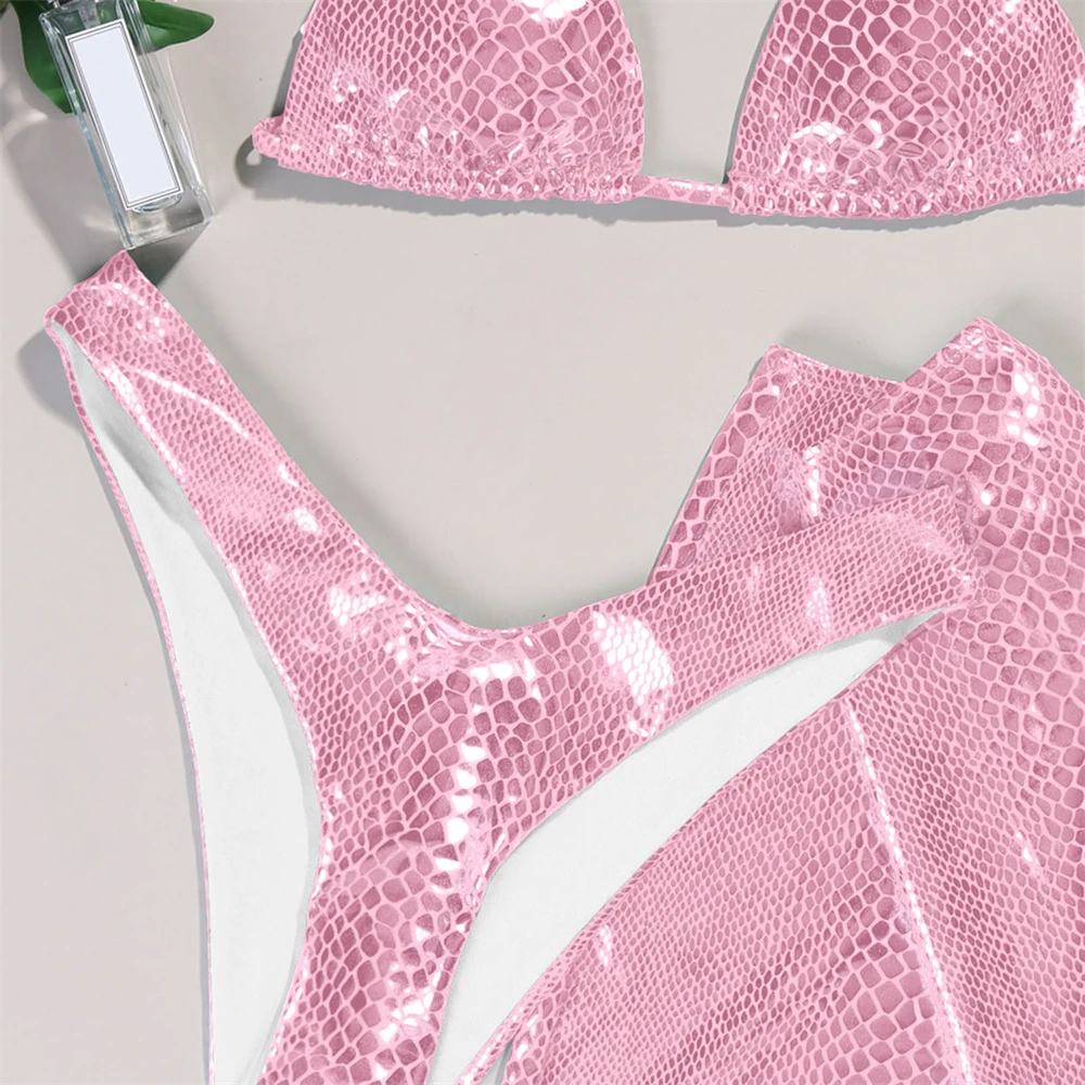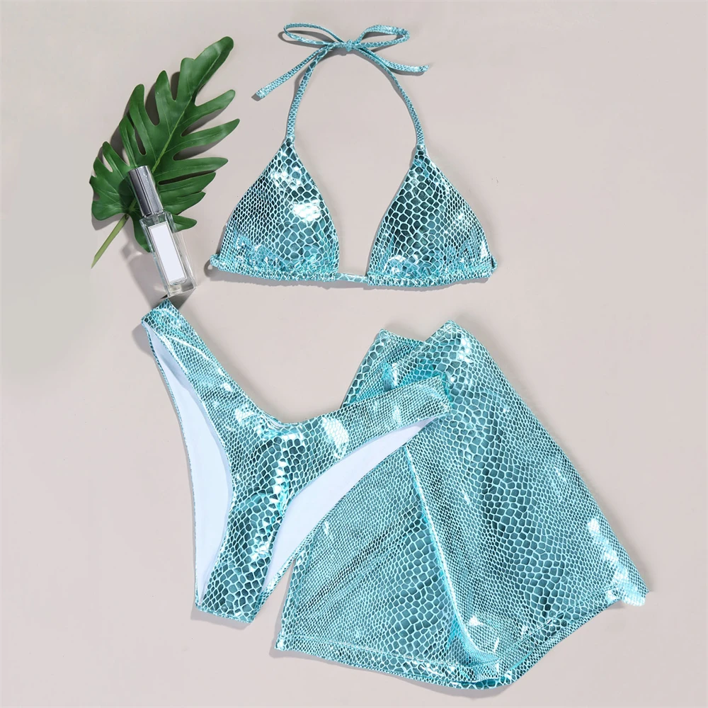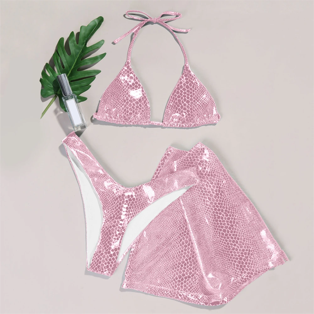 Sexy Three Piece Bikini Set Women Pu Leather Snake Print Swim Suits With Skirt Micro tanga Swimsuit Coverup For Women Beachwear